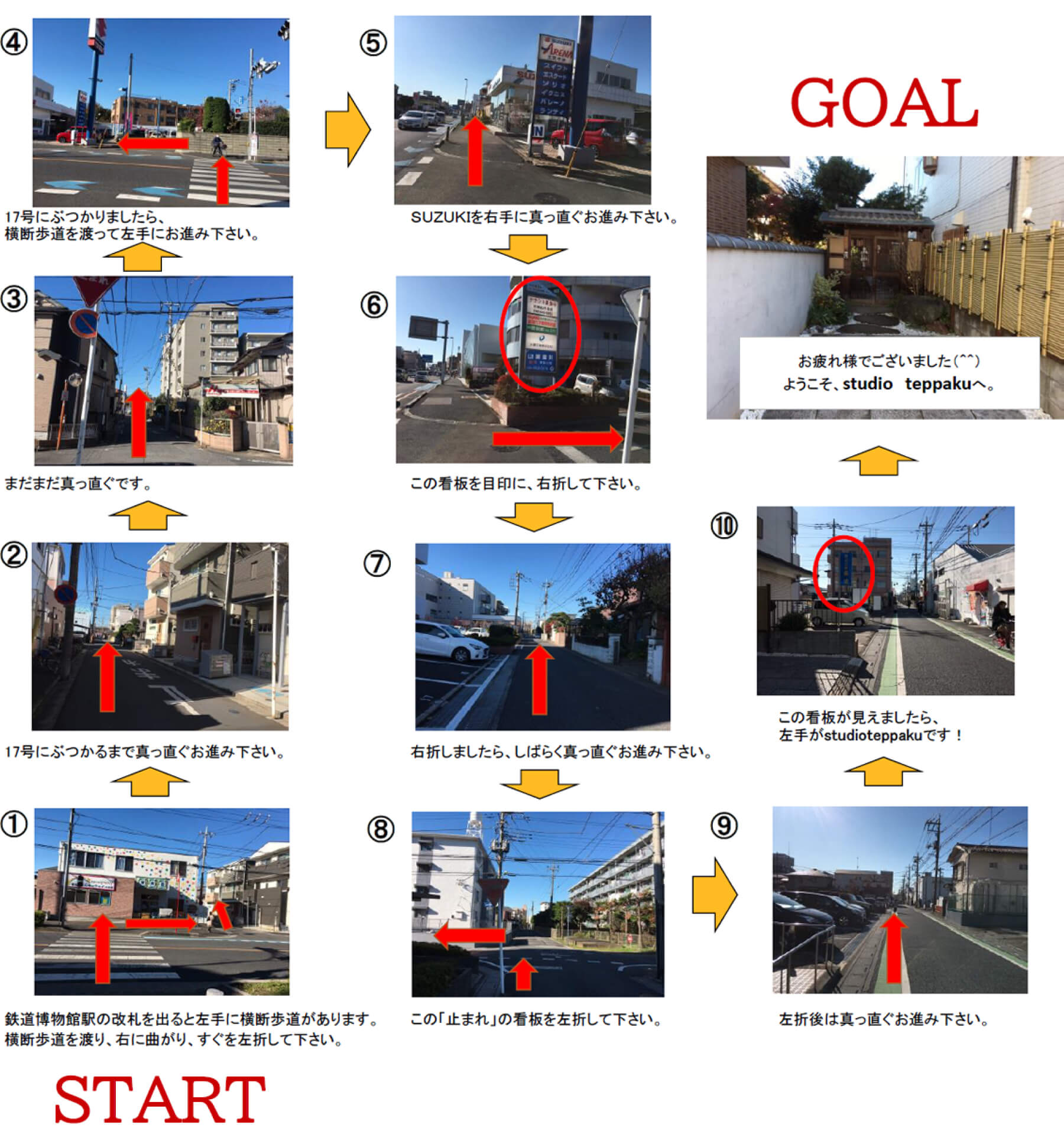 鉄道博物館駅から徒歩5分〜6分。鉄道博物館駅の改札口を出て、 すぐの信号を渡ります。右に歩き一つ目の角を左に曲がります。曲がりましたら、 17号にぶつかるまで、しばらく真っ直ぐとなります。 17号にぶつかりましたら、 信号を渡り、左手にお進み下さい。 しばらくまっすぐお進み頂き、 喫茶店を過ぎた角を右折してください。 その後はしばらくまっすぐ歩いて頂き、 1本目の角を左折となります。 その後は真っ直ぐ歩いて頂くと、左手にスタジオがあります。入口が細い路地になりますので見つからないときは電話頂ければすぐに対応します。