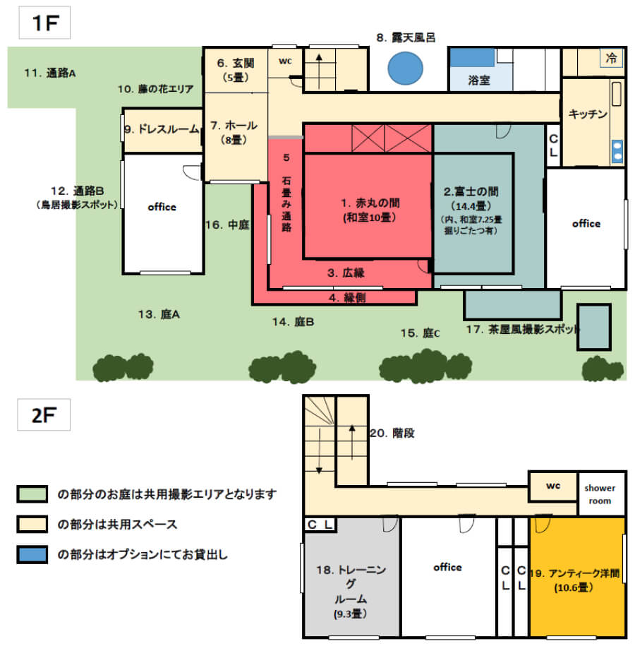貸し切りにできる部屋を4部屋用意しており、撮影、サロン、ジムなど幅広くご利用可能で 、ゆとりを持ってゲスト様が撮影できるように1日2組限定で予約管理しております。室内は貸し切りですが雨天時での館内とお庭での共有撮影ポイントでは皆様が円滑に撮影ができるようにスタッフからご案内や誘導することもありますのでご理解頂きますようお願い申し上げます。